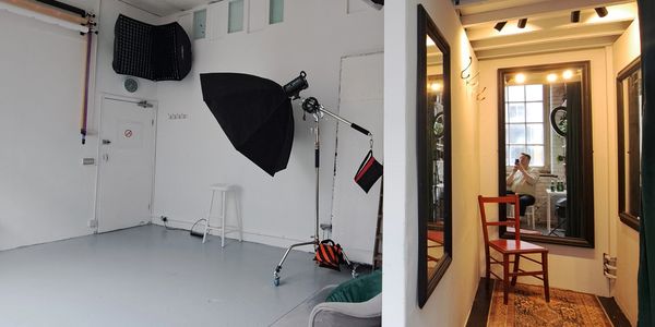 Within that space we have a changing room with full length mirrors, wall mounted backdrop support, clothing rail, pop up tables, a collection of stools, chairs, a small grey sofa and large wooden ladder.